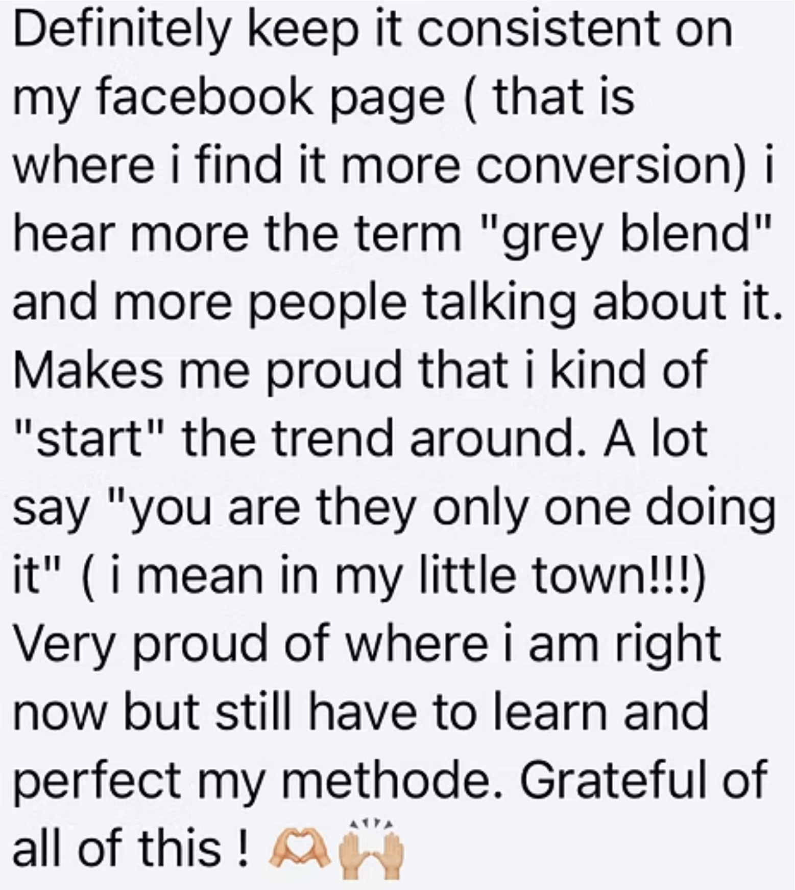 Offering Grey Blending Transformations has been the missing piece of the puzzle, and by identifying a common problem and knowing how to speak directly to VIP clients, I have learnt the tools to unlocking financial overflow consistently.